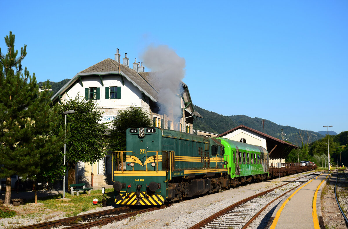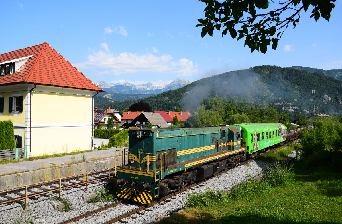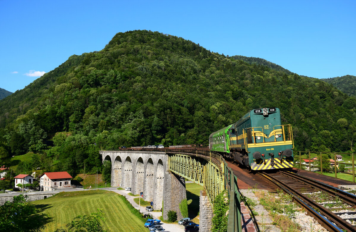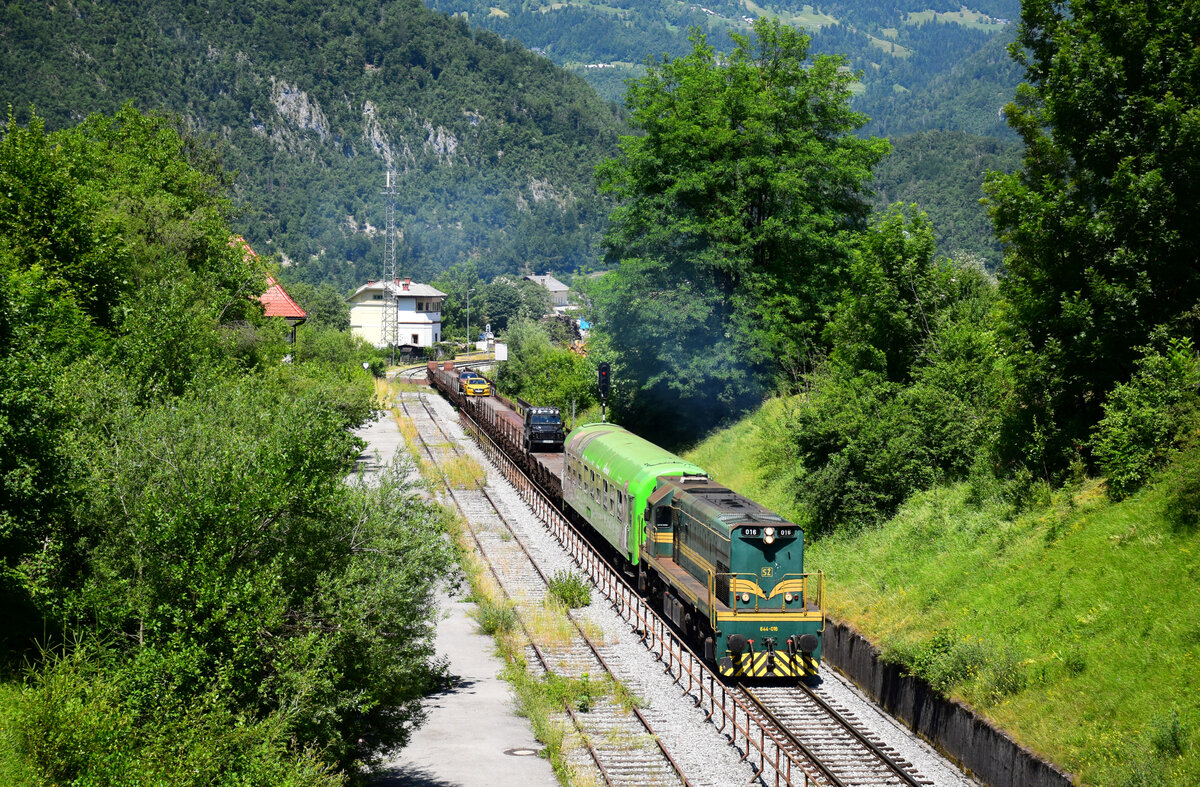 Die 664 102 "Reagan" mit dem Avtovlak AVT 859 auf dem Weg von Bohinjska Bistrica nach Most na Soci kurz vor Grahovo ob Bači.