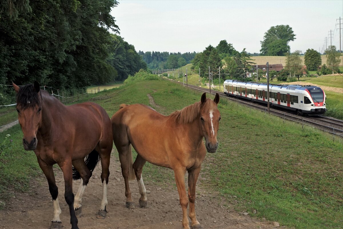 Die beiden hübschen Pferde scheinen sich am 17.Juni 2021 bei Niederbipp nicht gross um den Regionalzug Biel-Olten zu kümmern.