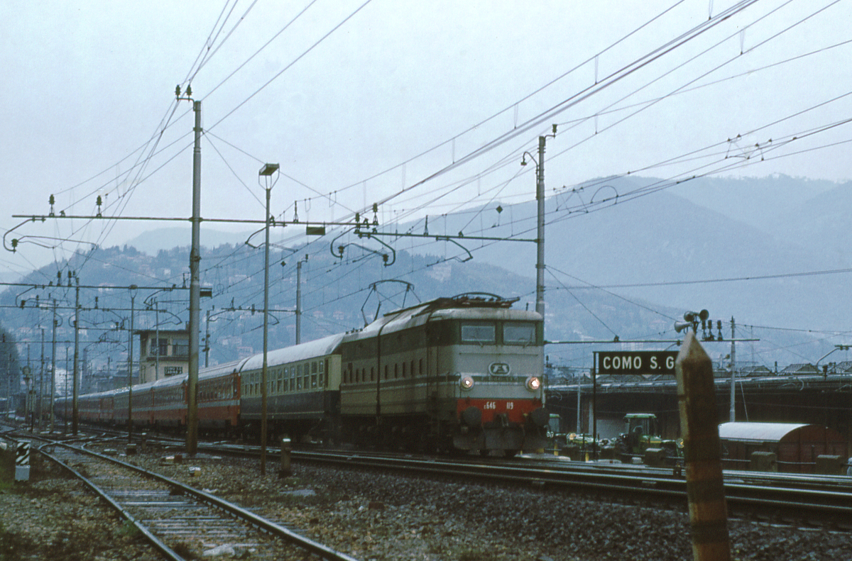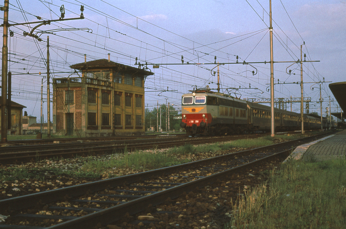 Die damals fabrikneue und moderne E656 250 durchfährt mit einem langen Schnellzug aus Süditalien den Bahnhof Fidenza Richtung Milano. Genau für solche Dienste wurde die E656 gebaut: Sie sollte die damals häufig aus 18 Waggons bestehenden Schnellzüge, welche Nord- und Süditalien miteinander verbanden, zuverlässig fördern und dabei noch Leistungsreserven zum Aufholen von Verspätungen haben. Tatsächlich wurden die Züge der FS Italia mit Einführung der E656, aber auch mit der Trennung von Nah- und Fernverkehr, ganz erheblich pünktlicher.