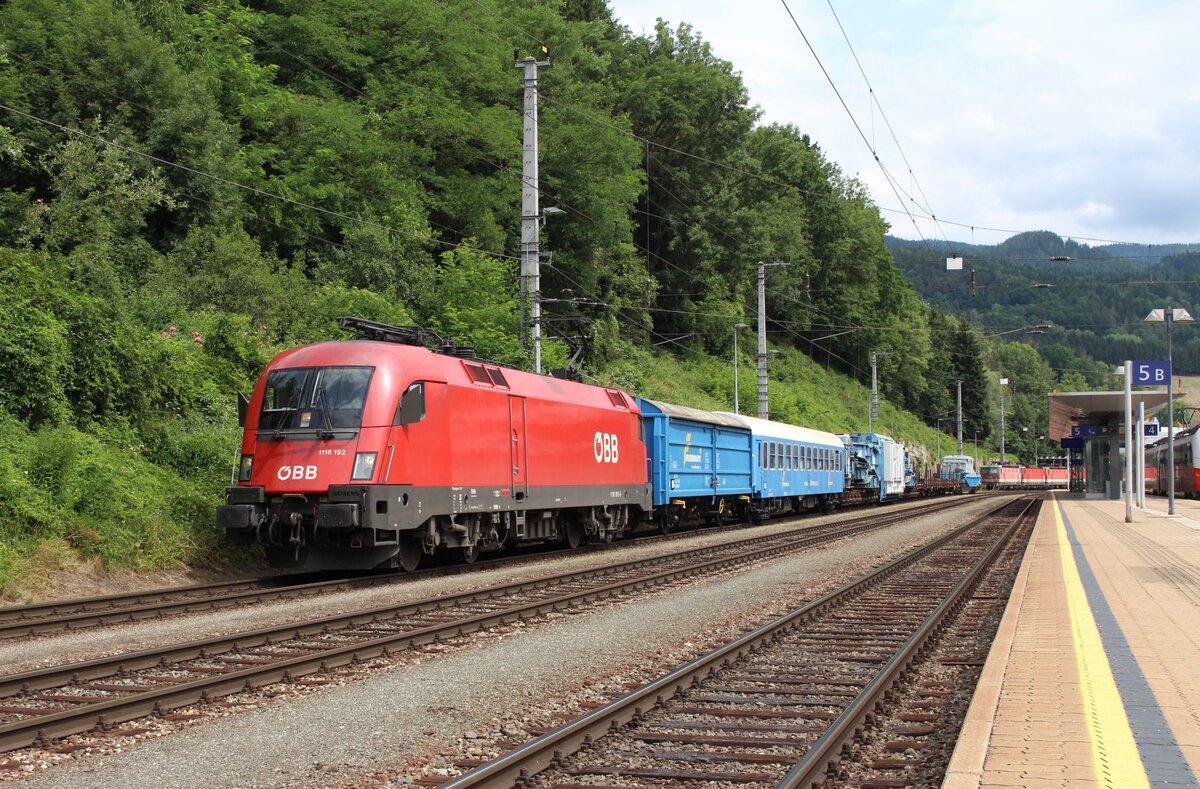 Am 11.7.2021 brachte die 1116 192 den Sondertransport bestehend aus einem Werkstattwagen, einem Begleitwagen, den 24-achsigen Trafowagen, drei Schutzwagen und dem 8-achsigen Trafowagen von Graz nach Linz Stahlwerke.