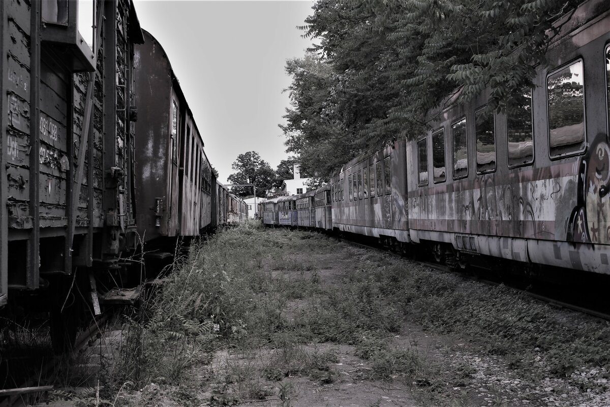 Im Eisenbahnmuseum in Strasshof stehen hier einige Güterwagen links sowie rechts zwei Speisewagen 7310 des legendären 4010er und vier Schienenbusse 5081 054 der ÖBB und 5081.14, 7081.27 und 6581.52 der Südburgenländischen Reigonalbahn SRB.