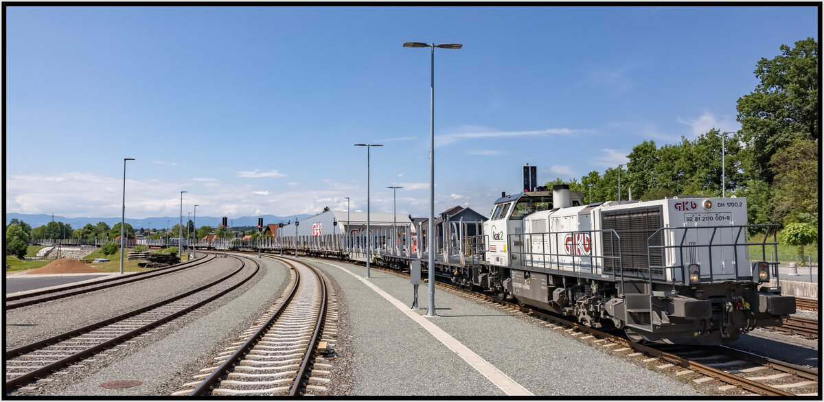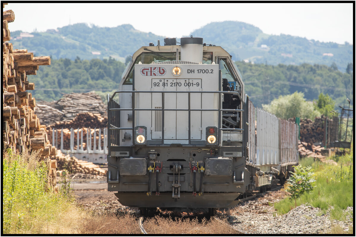 GKB DH 1700.2 durchfährt den Bahnhof Lieboch mit einem Ganzzug "Leergeschirr" aus dem Holzverarbeitenden Unternehmen "Hasslacher" in Preding richtung Graz .