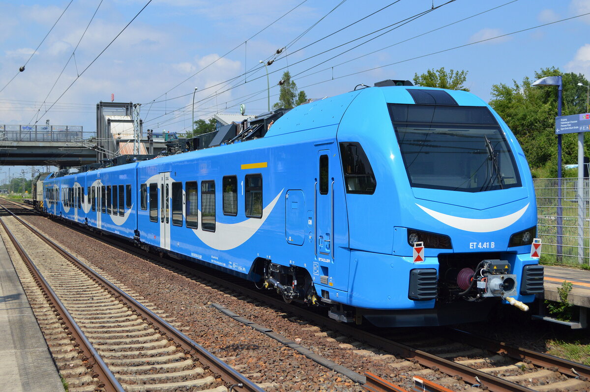 Hier ein fabrikneuer STADLER FLIRT3 4-teilig für die bayerische Go-Ahead GmbH (GABY), der "ET 4.41 A/B" (NVR: "94 80 1428 045-7 D-GABY + 94 80 1428 545-6 D-GABY") am Haken von MHG - Magdeburger Hafen GmbH "202 746-4" am 12.07.21 Durchfahrt Bf. Berlin Hohenschönhausen