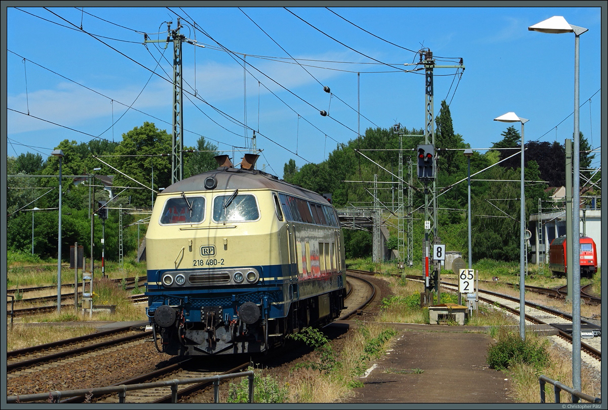 In Itzehoe endet der Fahrdraht auf der Marschbahn, hier werden die meisten Intercity-Züge umgespannt. 218 480-2 der Railsystems RP setzt sich am 28.06.2021 vor den IC 2072 nach Westerland.