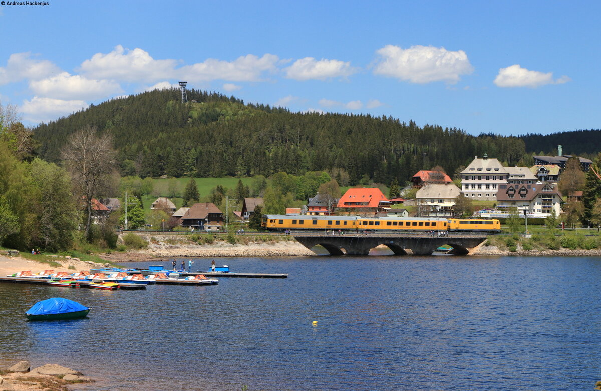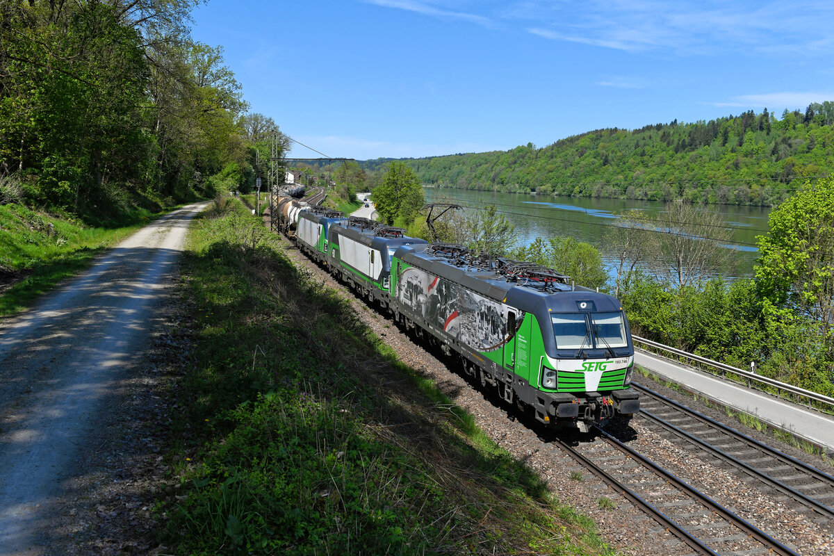 Neben einem leeren Kreideschlammzug aus Schwerte hatte am 10. Mai 2021 die 193.746 auch ihre kalt mitlaufenden Schwestern 193 752 und 285 im Schlepp. Bei Seestetten ist die Landesgrenze zu Österreich bald erreicht. Die äußere Gestaltung der SETG-Lok erinnert an das Theaterstück "Jedermann. Das Spiel vom Sterben des reichen Mannes" von Hugo von Hofmannsthal. Dieses wird jährlich bei den Salzburger Festspielen aufgeführt.