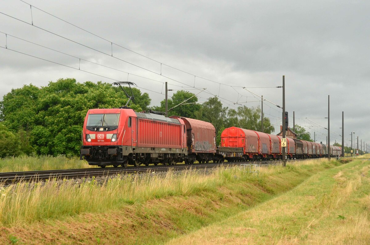 Mit einem gemischten Güterzug rollte 187 154 am 30.06.21 durch Braschwitz Richtung Halle(S).