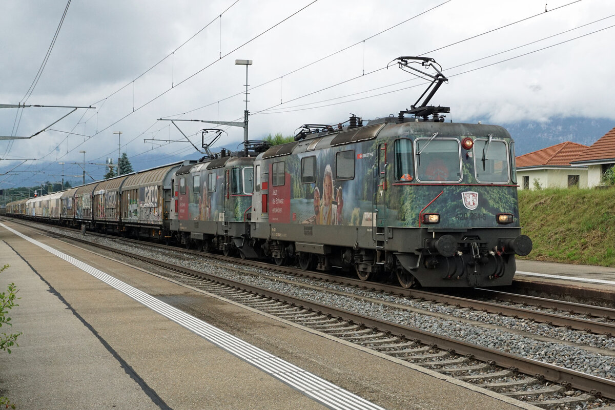 An 07.07.2021 schleppt die Re 484 009-6 die Re 484 001-3 durch den Bahnhof Pratteln.