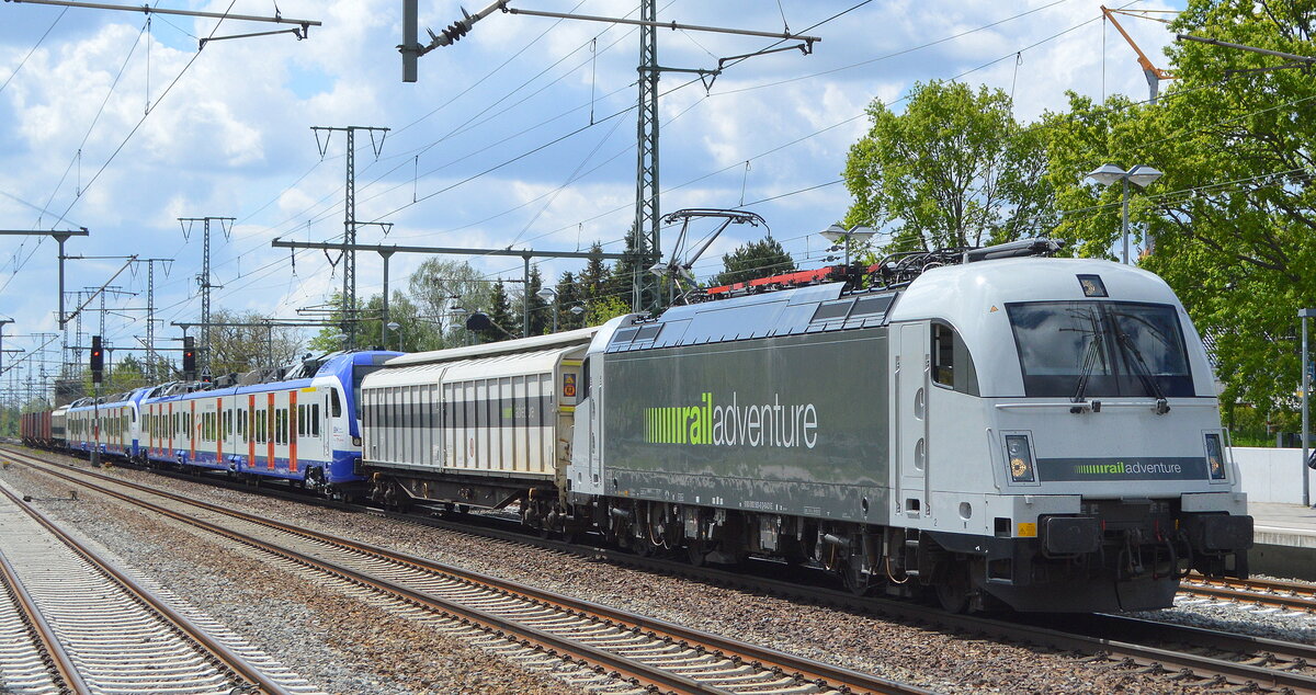 Railadventure mit ihrer "183 500" (NVR: "9180 6183 500-8 D-RADVE") mit der Überführung von zwei fabrikneuen FLIRT3 XL Triebzügen der BR 3 427 für die S-Bahn Hannover der Transdev Hannover GmbH am 19.05.21 Durchfahrt Bf. Golm (Potsdam).