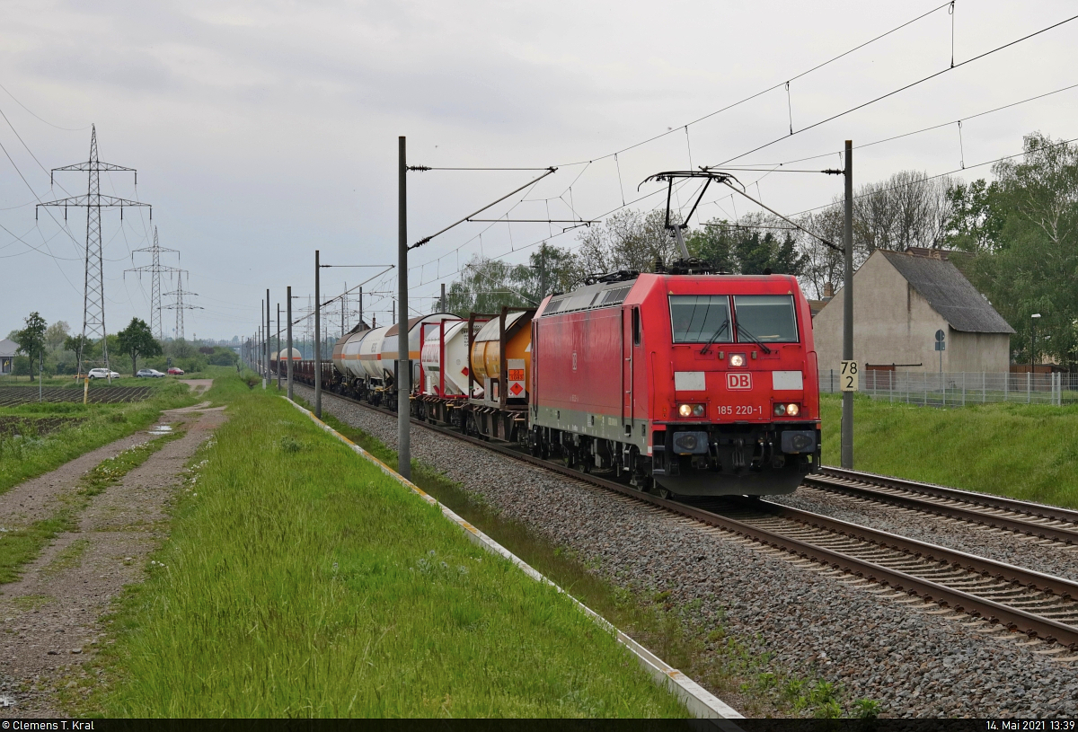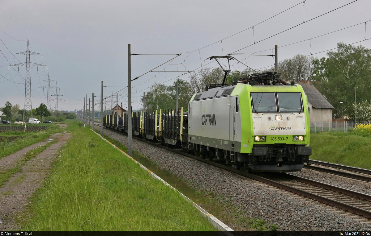 185 533-7 unterwegs mit Metallementen auf unternehmenseigenen Flachwagen mit Rungen an der Blockstelle (Bk) Braschwitz Richtung Köthen.