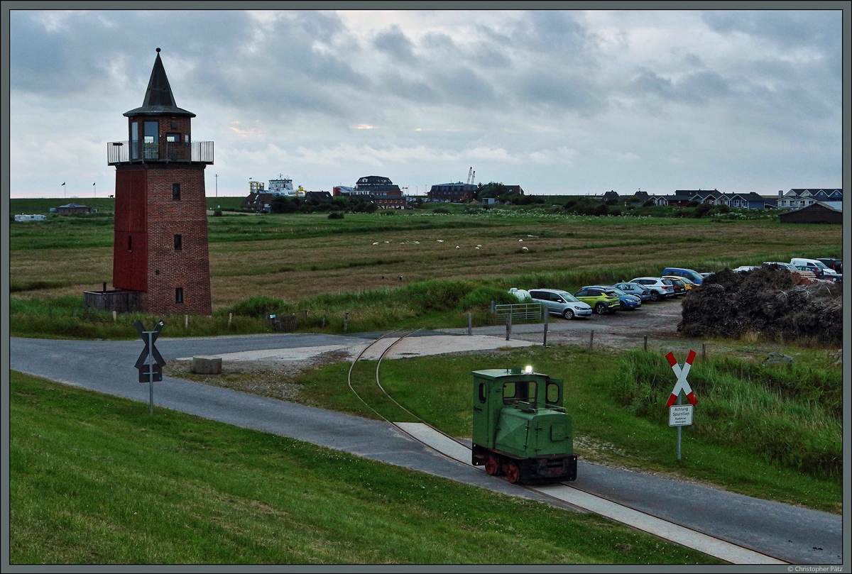 Schöma-Lok 2 des Landesbetriebs für Küstenschutz, Nationalpark und Meeresschutz verlässt am 30.06.2021 den Bauhof am alten Leuchtturm von Dagebüll Richtung Hallig Oland und passiert dabei den Bahnübergang am Fuß des Deiches.