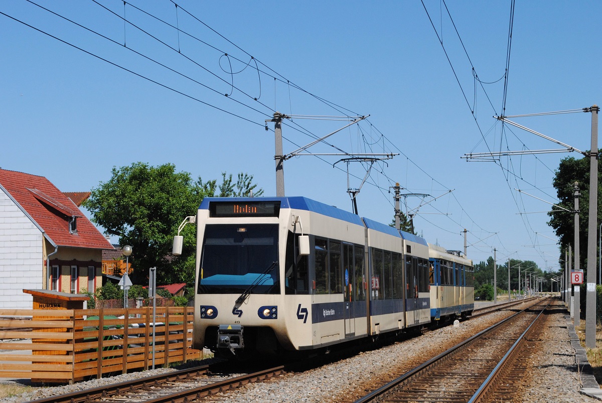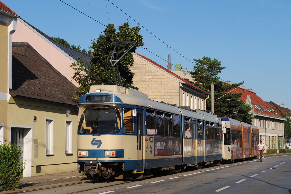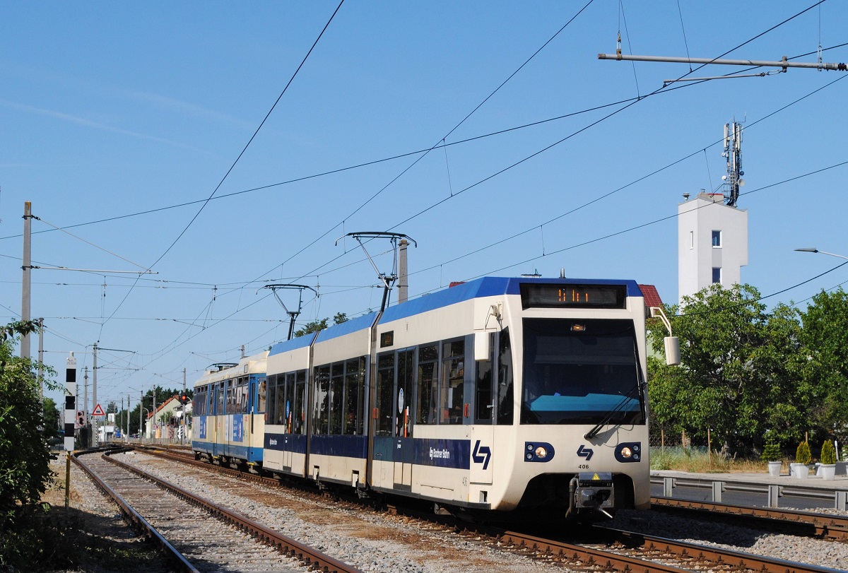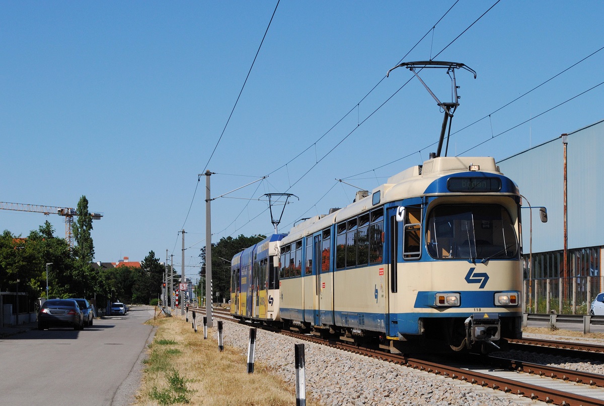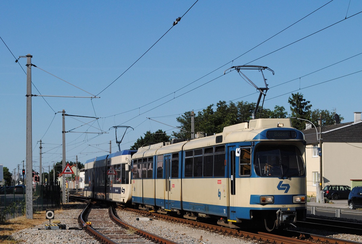 Tw.121 + 413 bei der Einfahrt in den Bahnhof Traiskirchen - Lokalbahn. (10.07.2021)