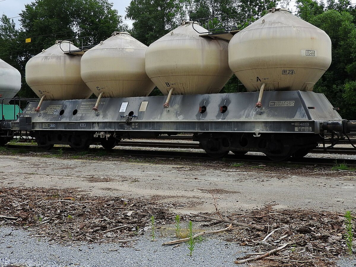 Private Loren verschiedener Bauart stehen am 29.06.2021 auf dem Ausweichgleis auf der Hallig Oland.