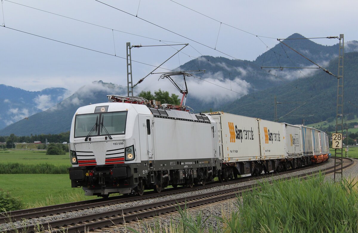 Vectron 193 599 bringt einen farblich abgestimmten Zug (ist ja schließlich Sonntag) aus düsterem Wetter in Richtung Rosenheim. 11.07.2021 bei Bernau/KBS 951.