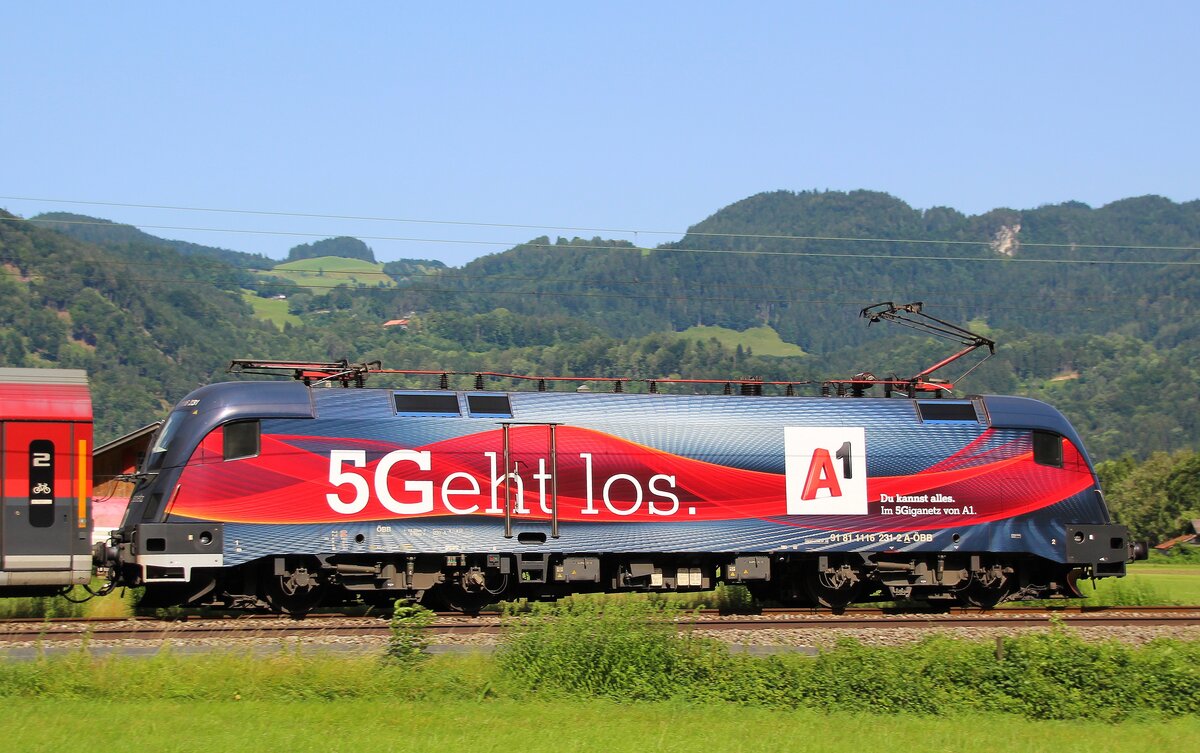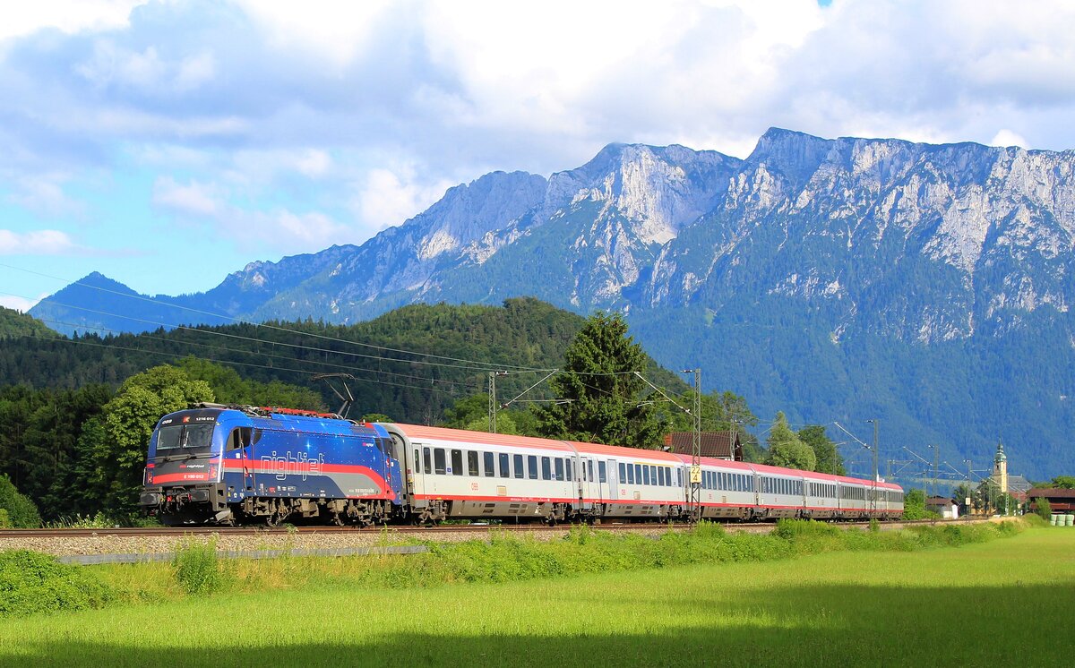 Vor Alpenpanorama präsentiert sich ein Eurocity mit populärer Taurus 1116 195 "Nightjet" am 11.07.2021 bei Oberaudorf.