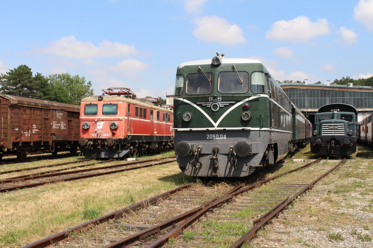Während die 2050.04 am 12.7.2021 mit einigen Verschubtätigkeiten im Eisenbahnmuseum Strasshof beschäftigt ist, warten links unter anderem die 2060.04 und rechts die 1110 023 in der Sonne auf ihr weiteres Schicksal.