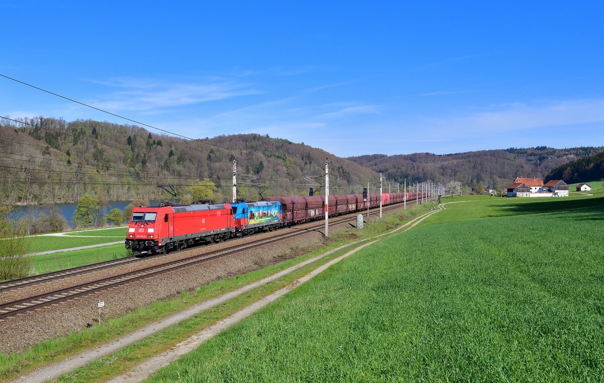 185 208 + 185 367 mit einem Erzzug am 27.04.2021 bei Wernstein am Inn.
