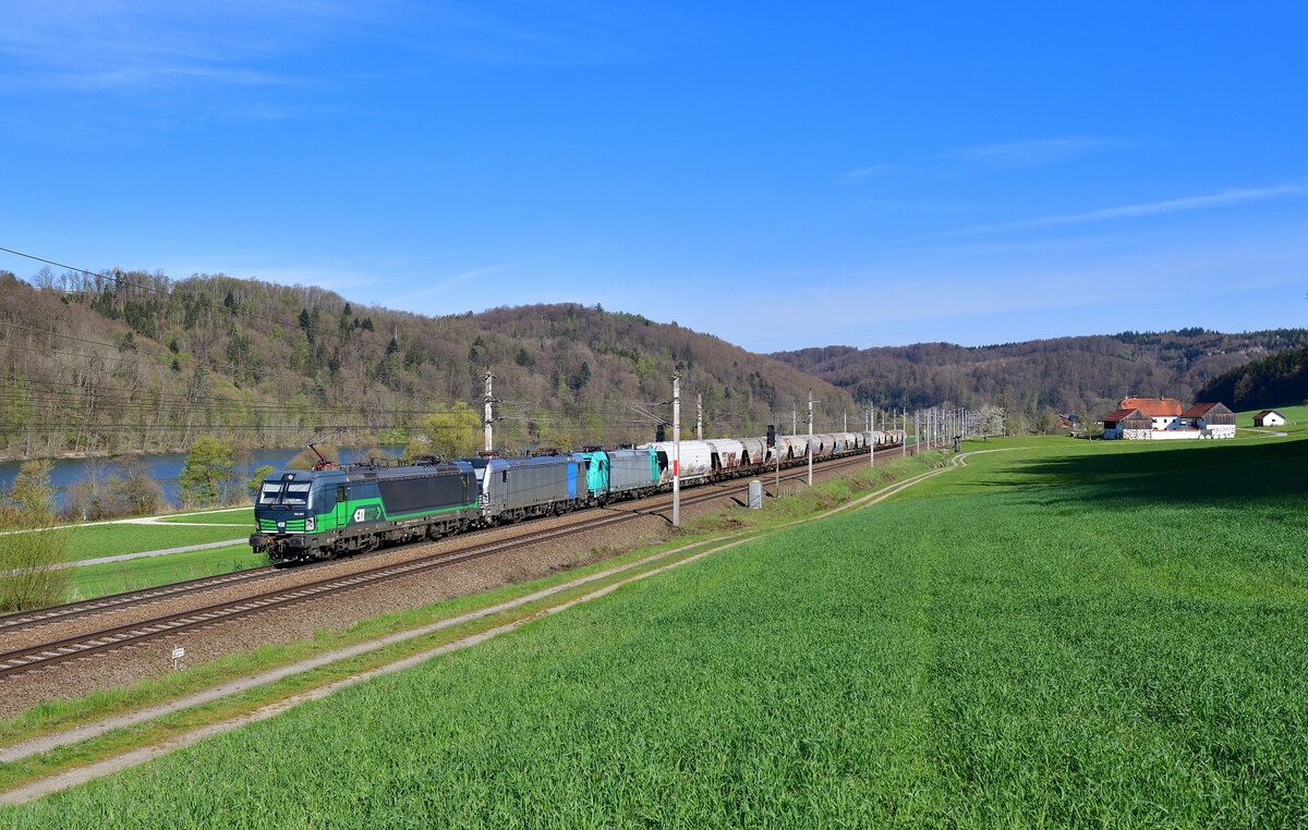 193 201 + 193 998 + 185 616 mit einem Getreidezug am 27.04.2021 bei Wernstein am Inn.