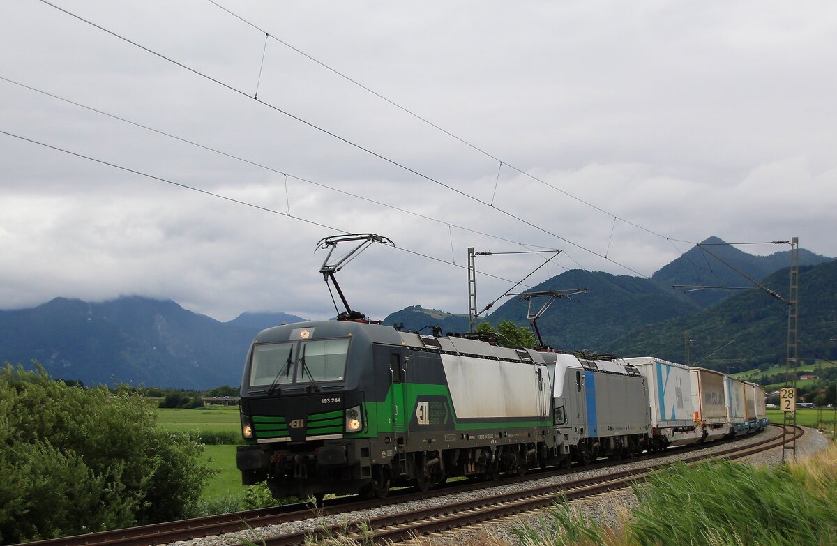 193 244 der ELL und 193 xxx der Railpool gemeinsam vor einem KLV auf der KBS 951 Richtung Rosenheim am 13.07.2021