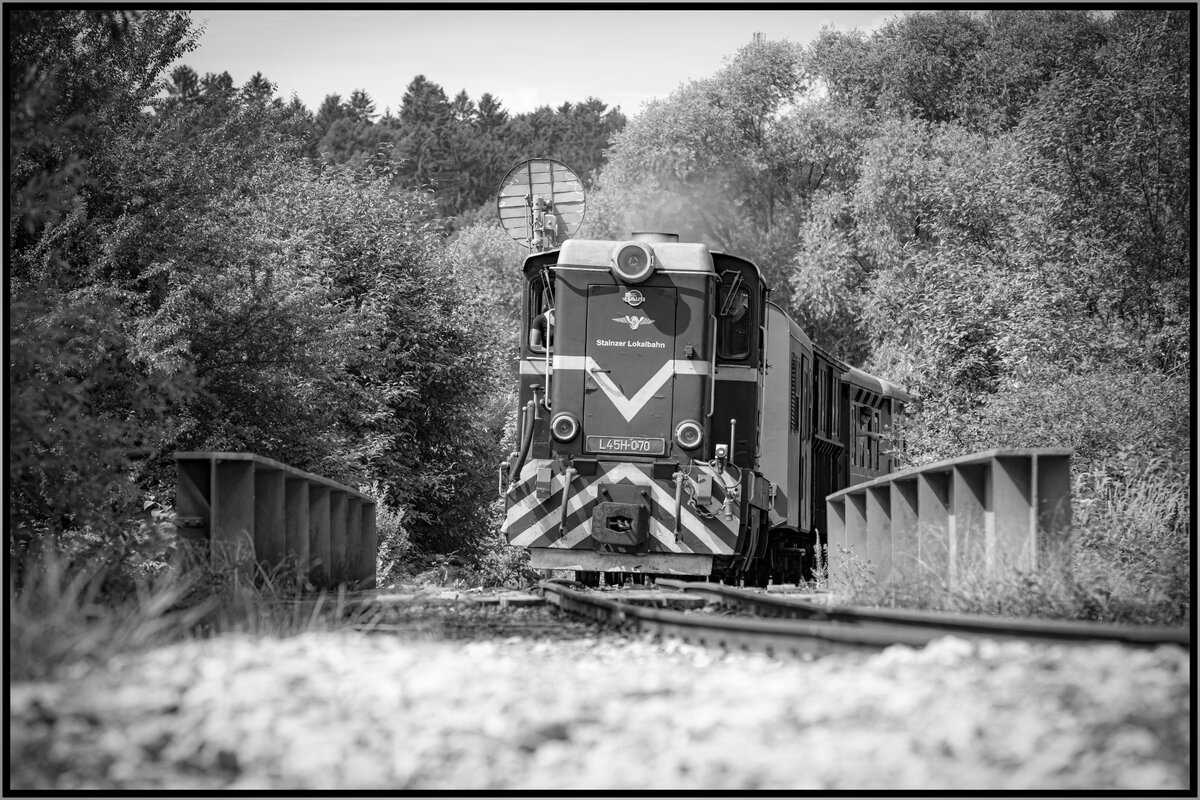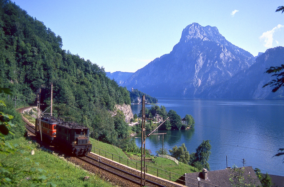 An einem eher bewölkten Mittwoch Vormittag 1998 fuhr die 2068 050 mit dem aus zwei Wagen bestehenden Fahrverschub den Lonsbergsattel bergwärts und überquert die markante Forellenfallbrücke.
