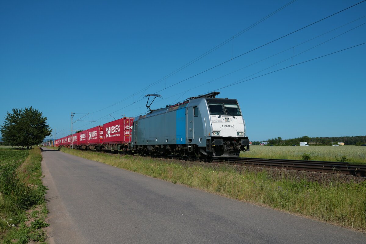 Railpool Bombardier Traxx 186 183-0 mit Containerzug in Babenhausen am 14.06.21