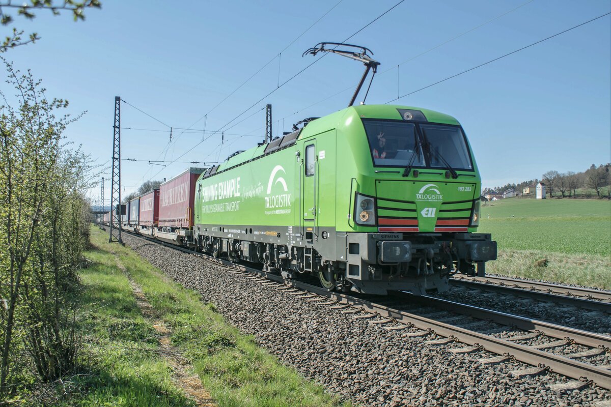 193 283-9 ist bei Eichenzell mit einen Aufliegerzug am 27.04.2021 in Richtung Norden unterwegs.