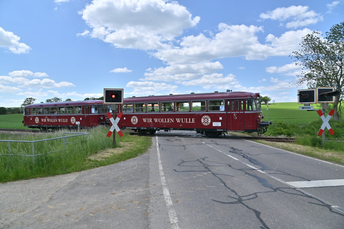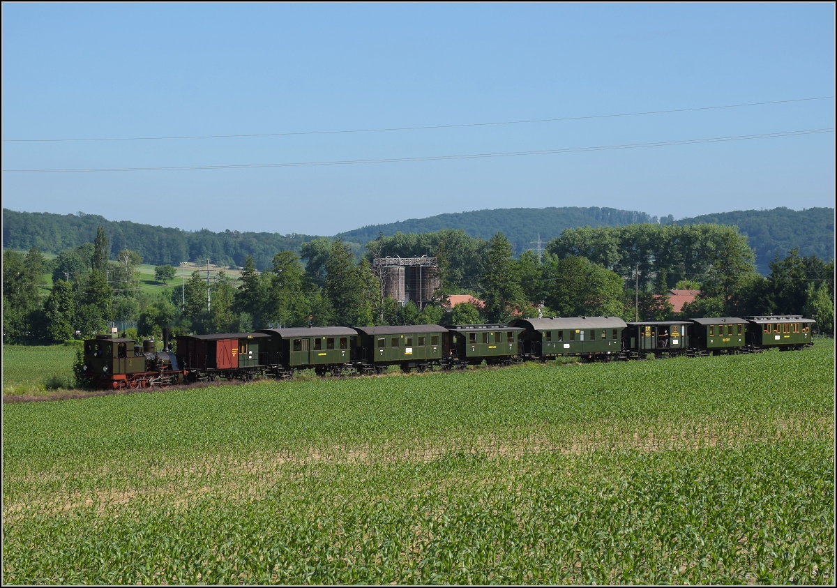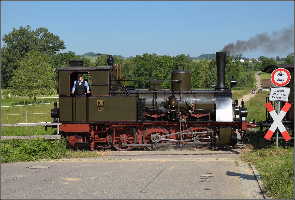 Das Kanderli fährt wieder, jeden Sonntag. Wollbach, Juni 2021. Man beachte auch, das unpassende Schild zum Zug auf dem Bahnübergang. Den neuen Lack hat aber die historische Bahn...