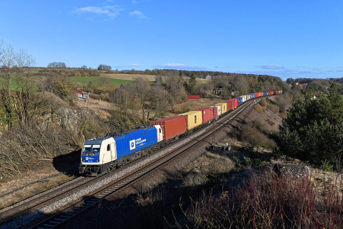 Am 21. Februar 2021 bespannte die 192 009 den DGS 43104 zwischen Kufstein und Leipzig Wahren. Bei Hagenacker im Altmühltal konnte ich den bunten KLV-Zug aufnehmen.