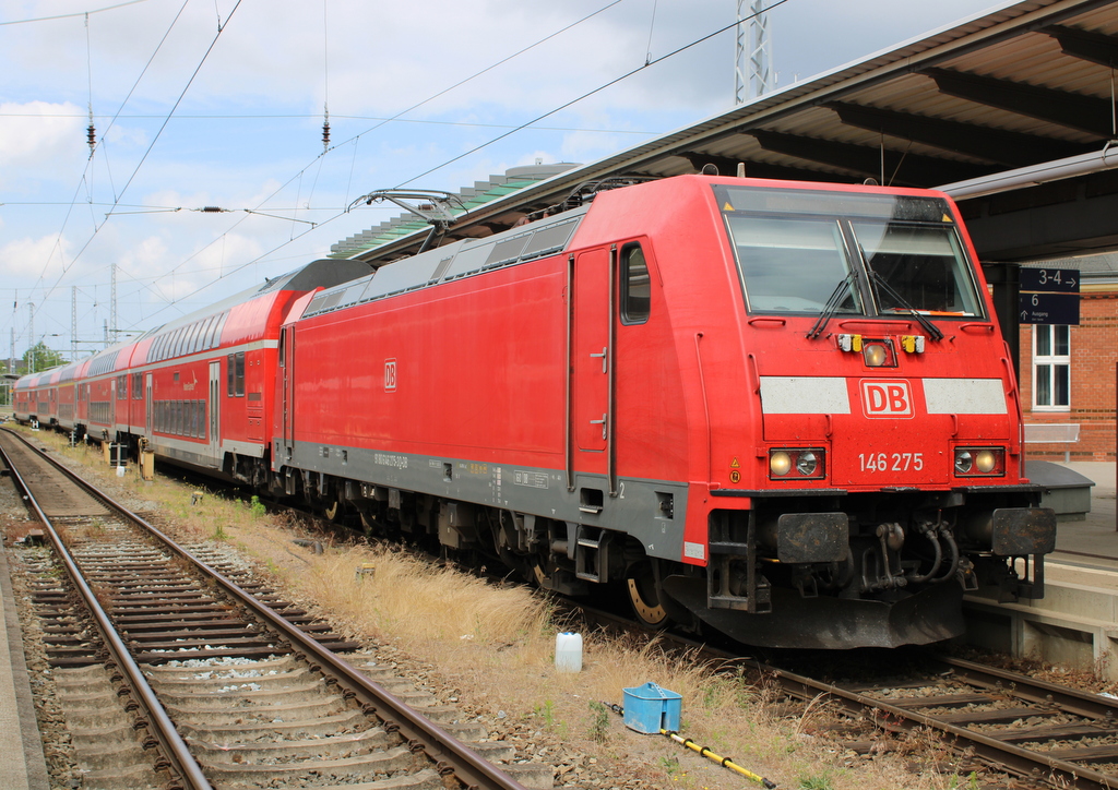 146 275-3 mit RE 4310(Rostock-Hamburg)kurz vor der Ausfahrt am 25.06.2021 im Rostocker Hbf.