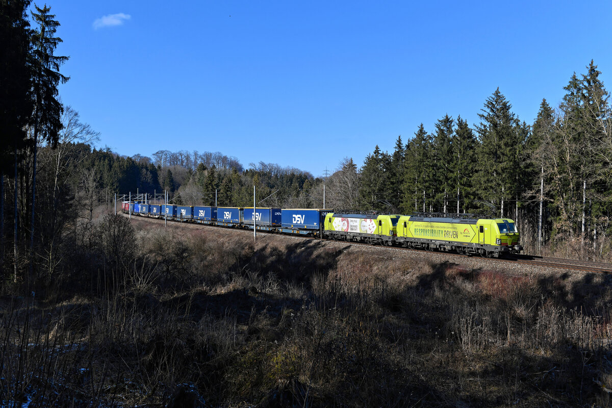 Die Schatten waren schon bedrohlich nah am Gleis, aber ein Bild des DGS 40565 von Padborg nach Verona Q.E. ging sich noch aus im Waldstück zwischen Grafing und Aßling. Der komplett beladene KLV-Zug wurde am 06. März 2021 von einem Alpha Trains Tandem in Form von 193 553 und 551 befördert. Die Lackierung der Loks hob sich in der noch kahlen Natur besonders gut vom Hintergund ab.
