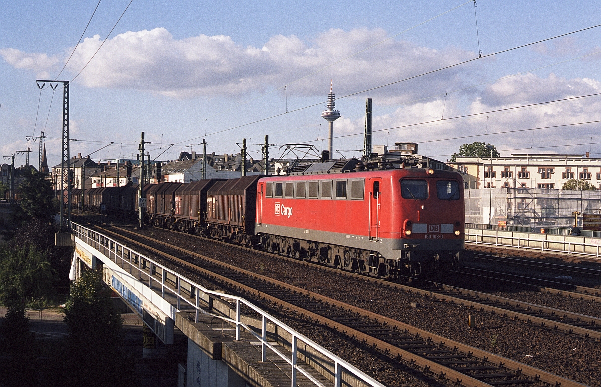Designierte Museumslok 151 049 mit Einholmstromabnehmer. Frankfurt Messe, 6.7.2000.