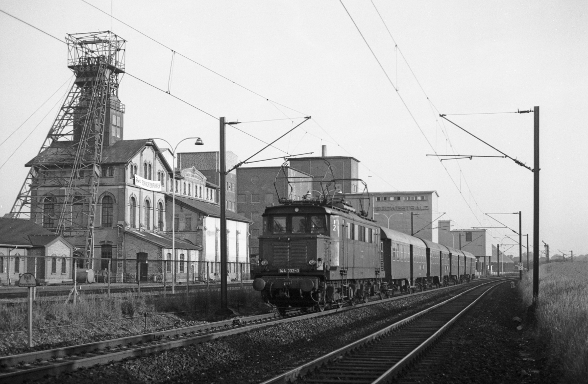 144 032 mit Nahverkehrszug Osterburken - Bietigheim-Bissingen vor der Kulisse der Saline im Bad Briedrichshall-Kochendorf (20.5.1981).