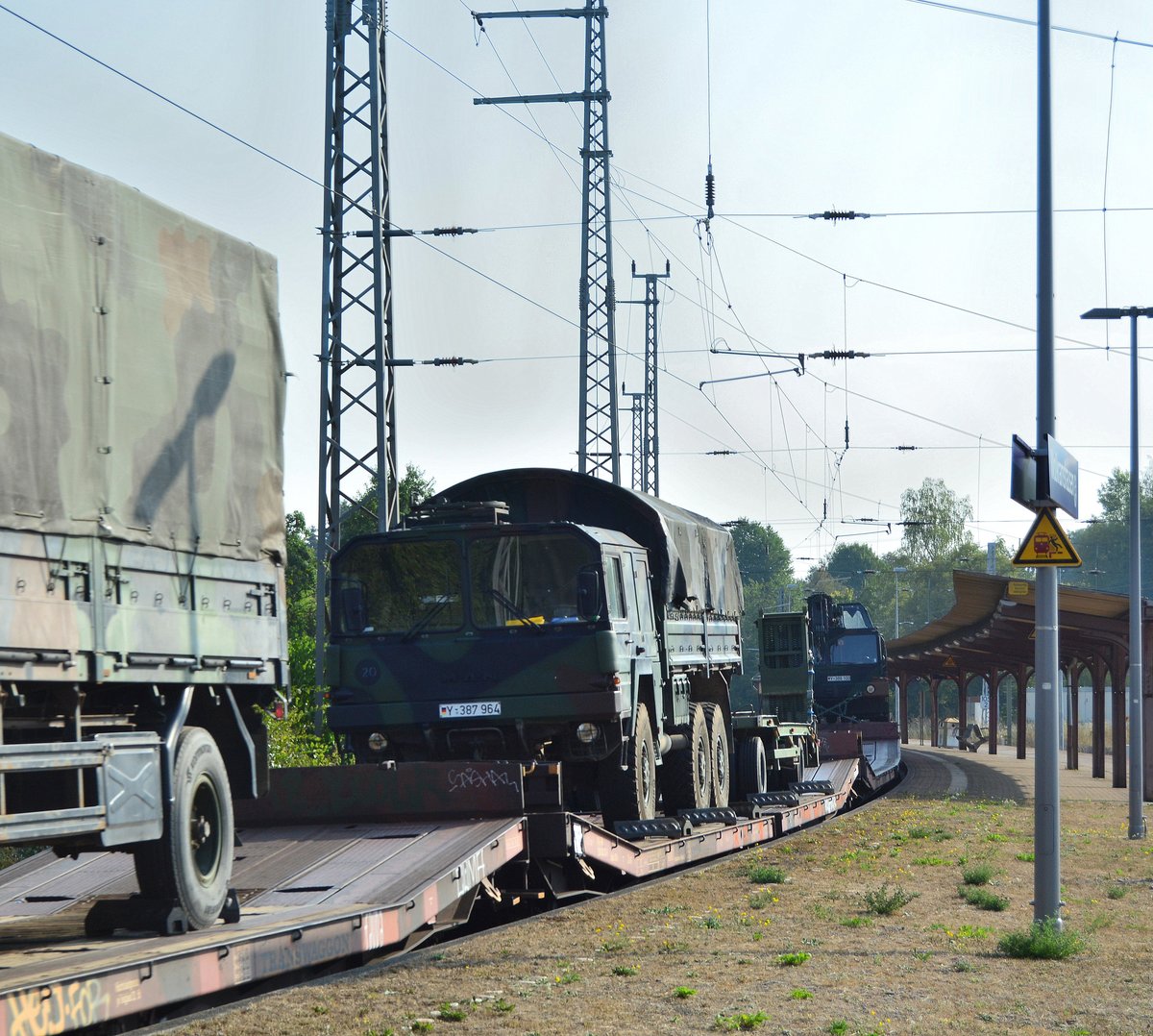 Blick auf einen Bundeswehrzug in Wolkramshausen auf den Weg in Richtung Leinefelde. Transportiert wurden Geländewagen Radlader Kranfahrzeuge und LKW.
