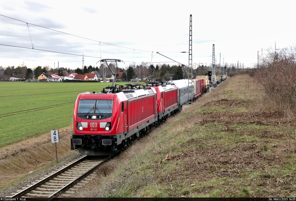 Hinter der führenden 187 131-8 sind u.a. eine kalte Schwesterlok, ein Liege- und Begleiterwagen für den Güter- und Sonderverkehr der Gattung  Bcmkh 240 , mehrere Container sowie Flachwagen mit etlichen Armeefahrzeugen (LKW, Humvee, Panzer) eingereiht.