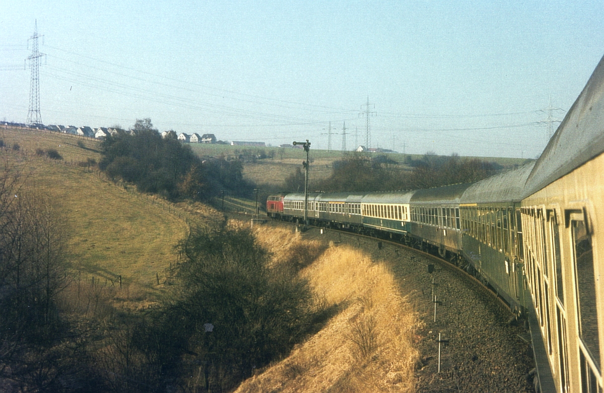 Mit verschiedenen (halbherzigen) "Eilzugexperimenten" versuchte die DB immer mal wieder, die Uplandstrecke aufzuwerten. 216 200 legt mit E 2845 Köln - Marburg (über Brilon-Wald !!) im Mai 1983 in Usseln einen Halt ein. Der erste Silberling stellte den "Stammzug" Köln-Marburg dar (nur 2. Klasse !), die beiden anderen waren Kurswagen Köln - Bad Wildungen, die - sicherlich zur "Freude" der Fernreisenden - ab Korbach auch als Schülerzug mit Halt auf allen Bahnhöfen dienten.