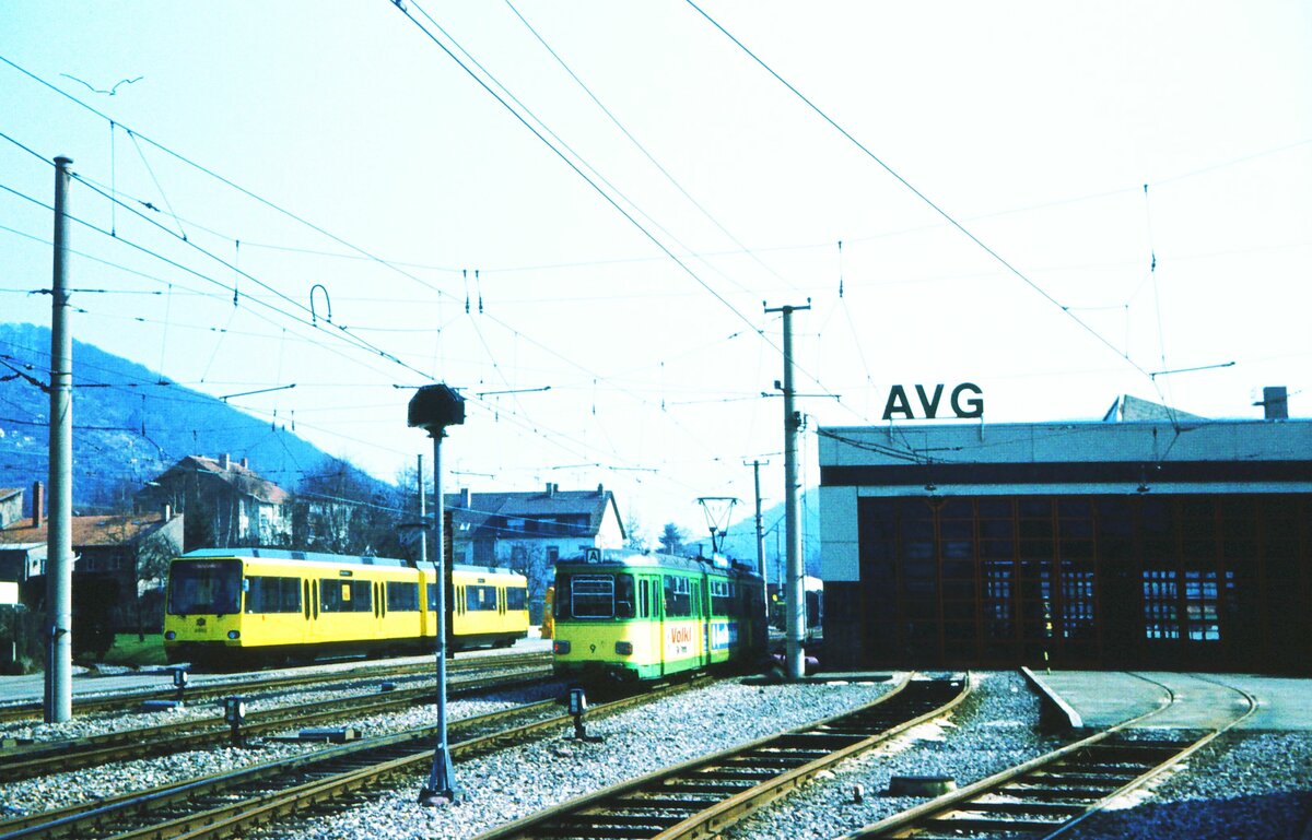 AVG Albtalbahn Bf. Ettlingen mit S-DT 8.1 der SSB Nr. 3001+3002 MAN,AEG,Siemens 1981; als Prototypen zu Testfahrten auf der Albtalbahn (da SSB damals noch überwiegend Meterspur); 3001 im Straßenbahnmuseum Stuttgart (SHB)