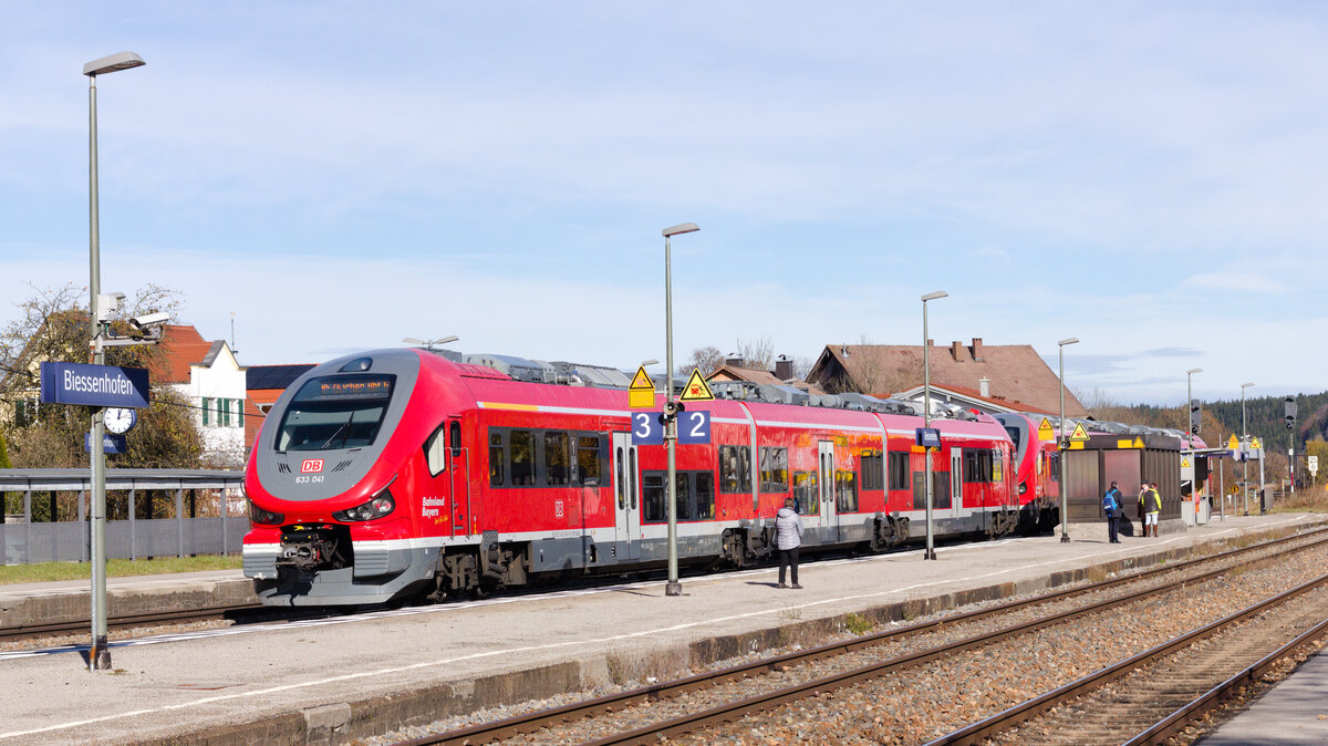 In der Nähe des Lindauer Ortsteils Schönau befindet sich 633 536 am 24.09.2021 als RE 77 / 3991 auf der Fahrt von Ulm nach Lindau-Insel. Aufnahmestandort an der im Bild rechts unten zu sehenden Leitplanke/Straße.