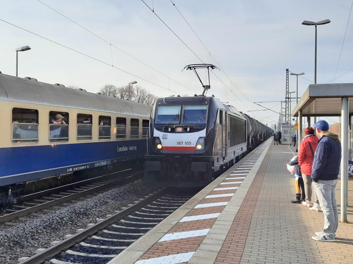 HSL Logistik GmbH, Hamburg [D] mit "187 307-4" [NVR-Nummer: 91 80 6187 307-4 D-Rpool] mit Kesselwagenzug am 11.11.21 Durchfahrt Bf. Golm.