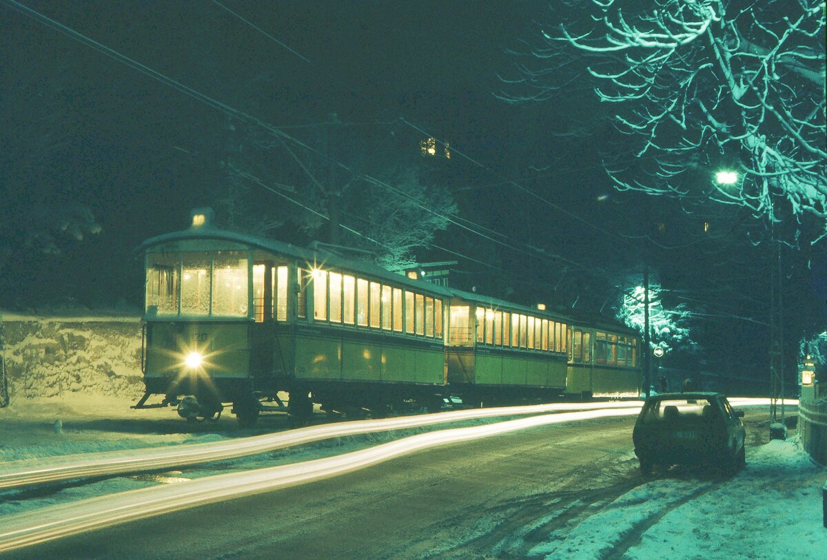 ZB Stuttgart 3-Wagen-Zug an der Wielandshöhe bei Nacht und Schnee Mitte der 70er