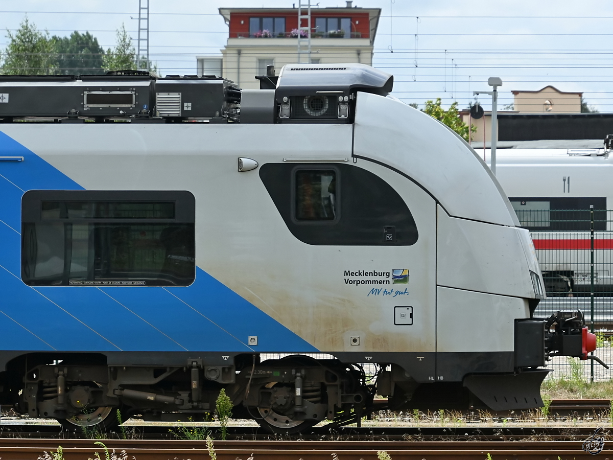Der Kopf des Elektrotriebzuges 4746 304, so gesehen Mitte August 2021 am Hauptbahnhof Stralsund.