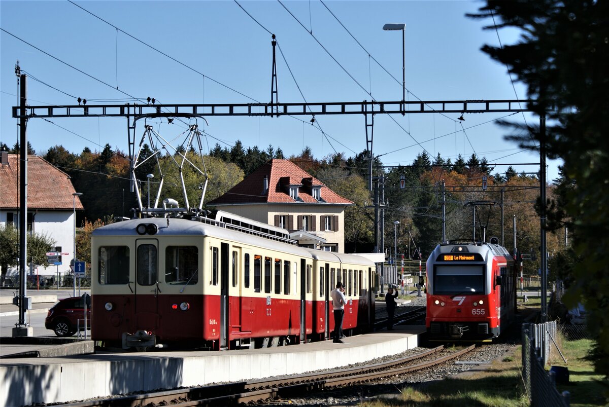 La Traction CJ Chemins de fer du Jura: CFe 4/4 601 (SIG Neuhausen/SAAS Genève 1953) + Ct4 702 (SIG Neuhausen/SAAS Genève 1952), Extrazug Pré-Petitjean-Tavannes, Leerfahrt zum Abholen einer Gruppe in Tavannes, Pré-Petitjean, 23. Oktober 2021. Dieser Pendelzug, im Eigentum von La Traction SA, wird als "Train des Horlogers" (Uhrmacherzug) angeboten. Der Triebwagen besitzt eine Bestuhlung wie einst mit Sitzflächen und Rückenlehnen aus Holz, der Steuerwagen ist als Salonwagen ausgestattet. Die Triebwagen 601 bis 608 und die Steuerwagen 701 bis 706 kamen 1953 in Betrieb (Erneuerung und Elektrifizierung der Strecke La Chaux-de-Fonds-Glovelier).