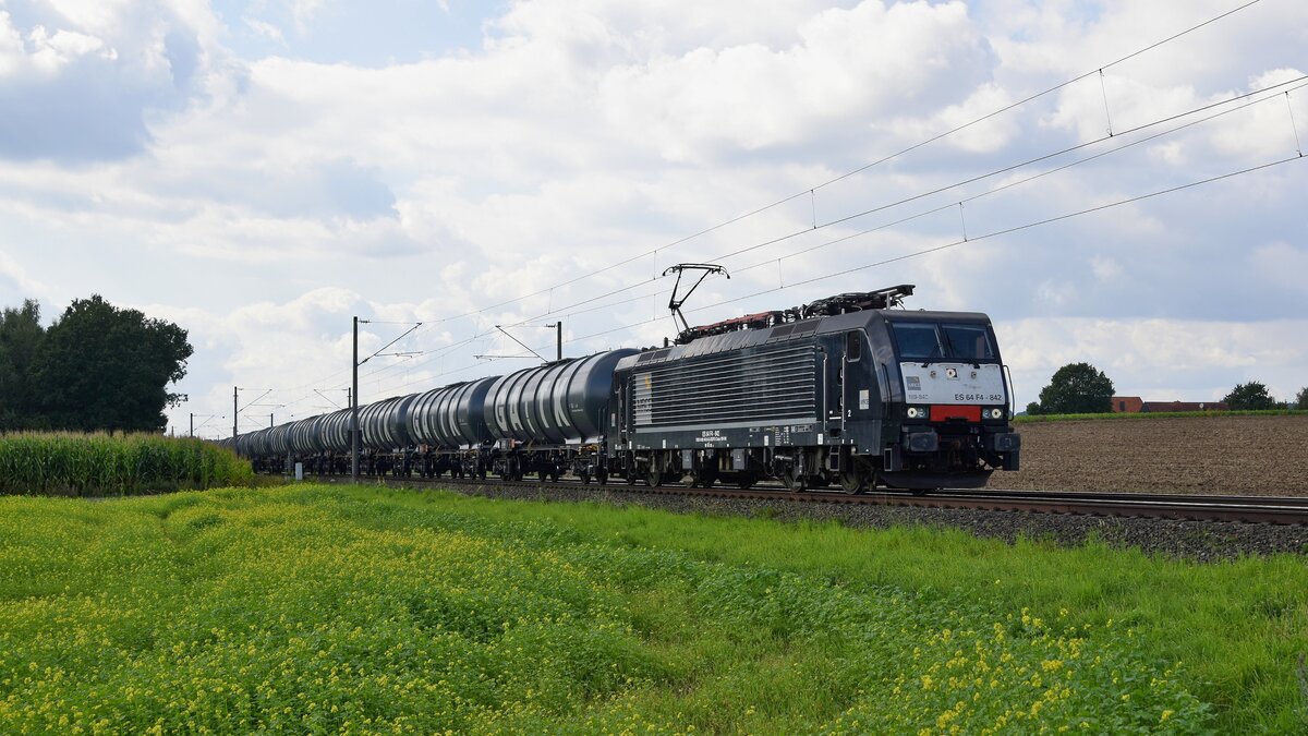 MKB V6 (216 014) mit Kesselwagenzug während eines heftigen Regenschauers in Richtung Minden (Landesbergen, 27.08.2021).