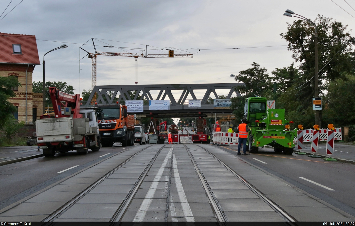 Gleich drei Brücken wurden am 9. und 10. Juli in der Merseburger Straße in Halle (Saale) eingeschoben. Dafür kam auch ein Schwerlastkran zum Einsatz. Ebenso waren Mitarbeiter einer niederländischen Spezialfirma vor Ort - erkennbar an den gelben Kennzeichen der Fahrzeuge.