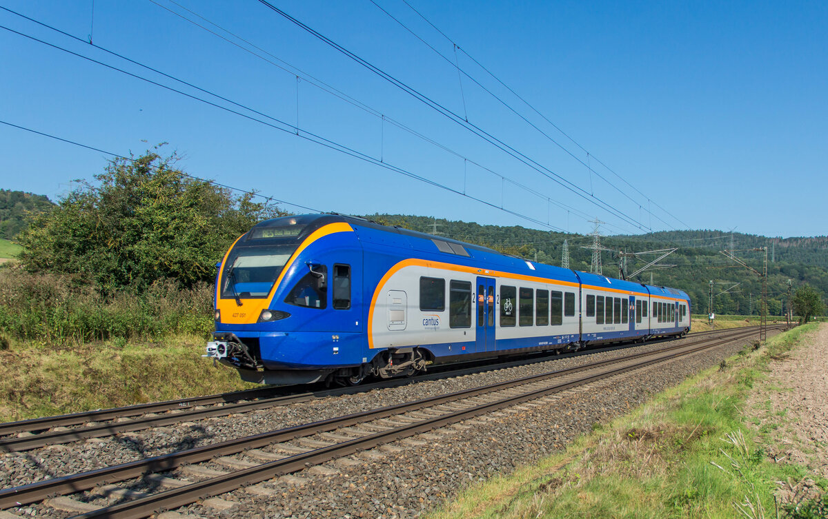 Auch ein 427 (Stadler FLIRT) ließ sich auf der Werrabrücke bei Hann. Münden-Laubach verewigen. 🧰 cantus Verkehrsgesellschaft mbH 🚝 RB 24019 (RB83) Göttingen–Kassel Hbf 🚩 Bahnstrecke Halle–Hann. Münden (KBS 590) 🕓 10.7.2021 | 13:45 Uhr