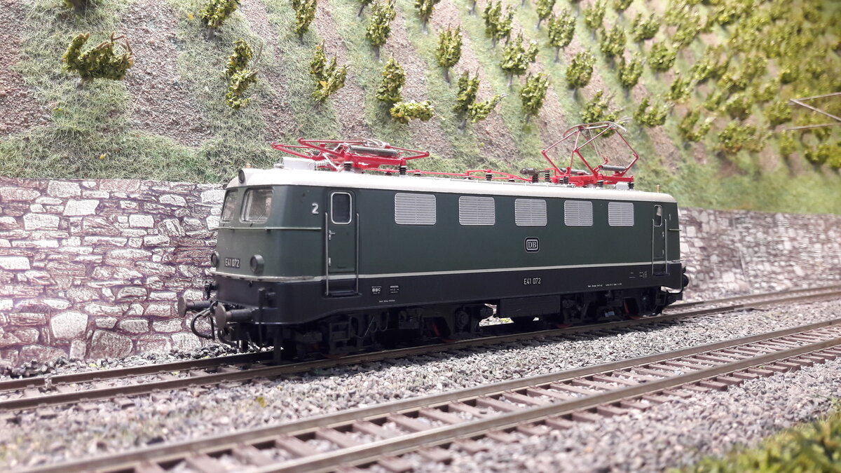 Die Baureihe E10/E40/E41, 5 Vorserienmaschinen ( dazu gab es schon Bilder und Erklärungen) . Die ersten Serienlokomotiven waren die E10 Kasten ab 1956. Die Baureihenbezeichnungen durchliefen die Ordnungsnummern (ab 1968 ) 110 / 112 / 113 / 114 / 115 . Da die Lok als Einheitslokomotive entwickelt wurde, gab es in der Kastenvariante noch die E40 (140), (139) , E41 (141) und die E50 (150 ). Die ersten Kasten E10 waren die E10.1 , spätere Ausführungen der Kasten E10 bekamen die Doppellampen vorne , das waren die E10.2 . Ab Maschine 288 wurde dann die Bügelfaltenform eingeführt, welche zuvor schon an den Rheingoldmaschinen realisiert wurde. Diese wurden als E10.3 bezeichnet , die Rheingoldmaschinen liefen unter E10.12. Es gab unglaublich viele Varianten , mit Regenrinne und ohne, verschiedenste Lamellenausführungen, usw. usw . Auch etliche Farbvarianten hat die Lok durchgemacht. Die BR E41 / 141 war grundsätzlich kürzer wie E10 und E40 . Hier das Modell der ersten Serien E41, E41 072 , nun in der Standartfarbe grün , keine Maschinenraumfenster, Regenrinne, Schweigerlamellenlüfter, Griffumlauf vorne , Einfachlampen,  Modell Roco 43637 DC nachdigitalisiert