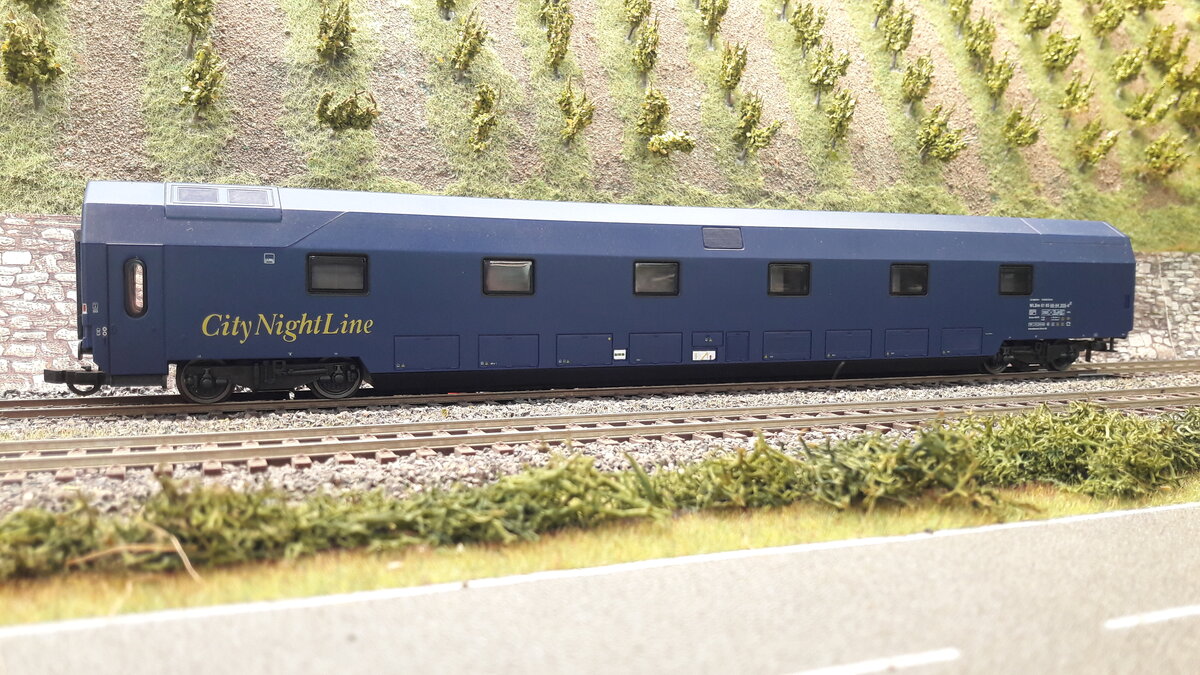 Nachtzüge in Europa, CNL (City Night Line), DB Autozug, Fernzüge wie der   Jan Kiepura   usw. brachten ab Mitte der 90er Jahre bis weit ins 21 Jahrhundert ein schönes buntes Erscheinungsbild auf die Schienen. Einzelwagenbilder mit Wagentypen, wo nötig weil 2 verschiedene Seiten, dann 2 Bilder pro Wagen. Hier nun ein Doppelstock Schlafwagen WLABm in der ersten blauen Lackierung diesmal mit großer Aufschrift City Night Line, rechte Seite. Modell Heris aus Sammleredition 1, 39001