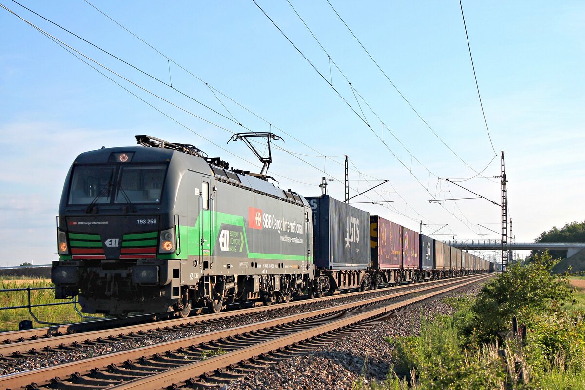 Zweimal Vectron: DB 193 313 und Lokomotion 193 775 durchfahren mit einem Güterzug den Bahnhof Rothenthurn nach Südwesten in Richtung Villach.