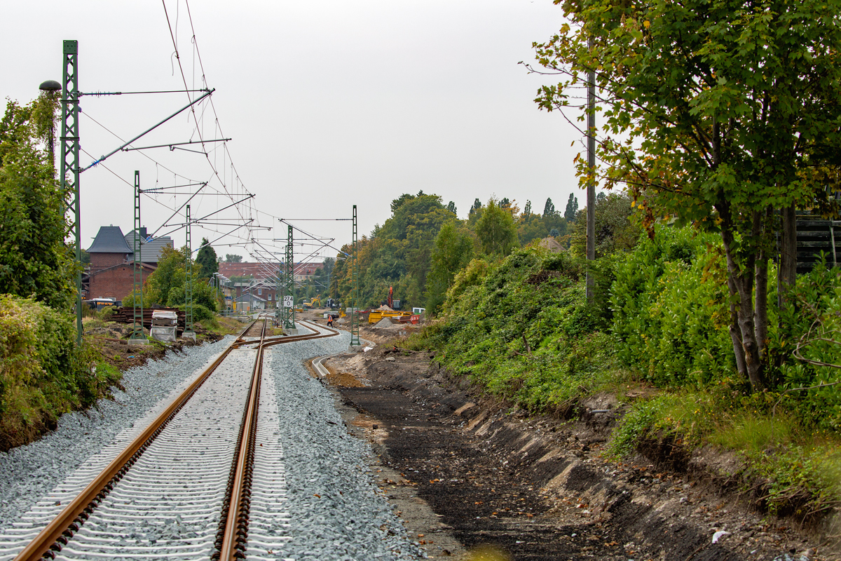 212 039 von Railflex fährt mit dem aus sechs dreiachsigen Umbauwagen bestehenden Sonderzug nach Flandersbach in Ratingen Ost ein (26.9.21).