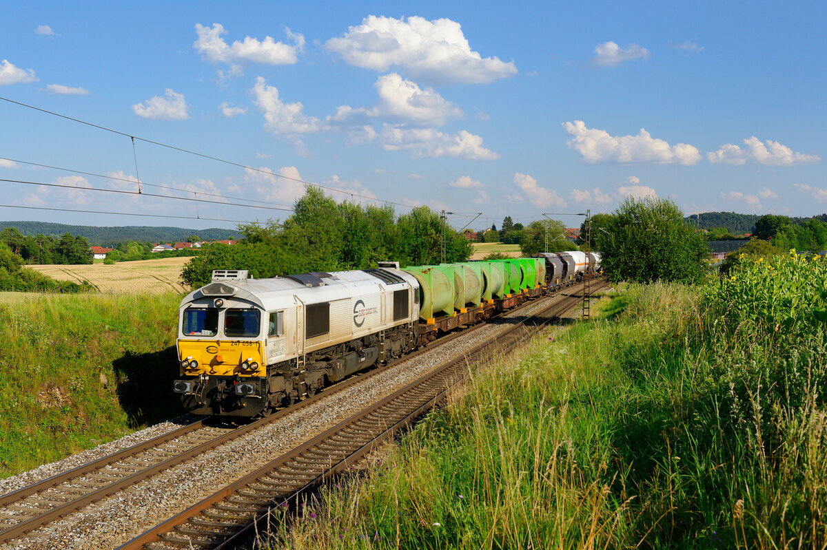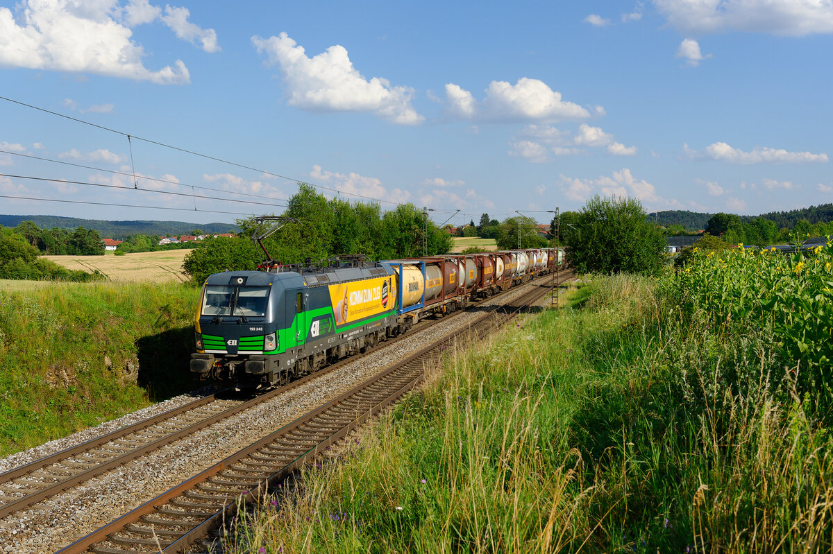 193 243 ELL/WLC "Komm zum Zug" mit einem Tankcontainerzug bei Parsberg Richtung Nürnberg, 20.07.2020