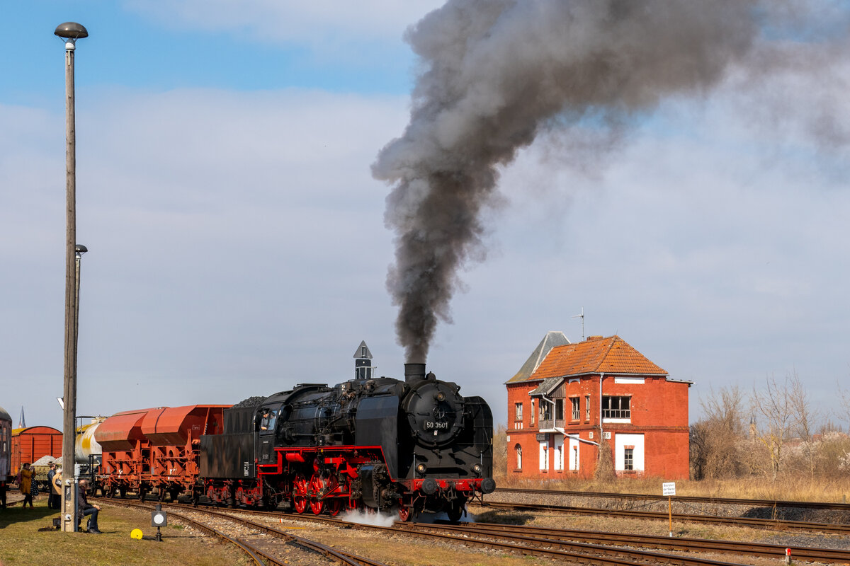 Anlässlich des Frühjahrsfests der Eisenbahnfreunde Staßfurt war 50 3501 am 26.03.2022 mit einem Fotogüterzug über den hiesigen Ablaufberg unterwegs.