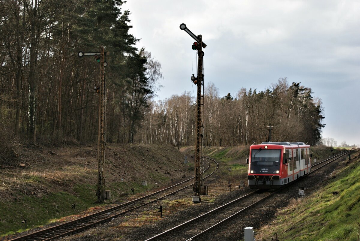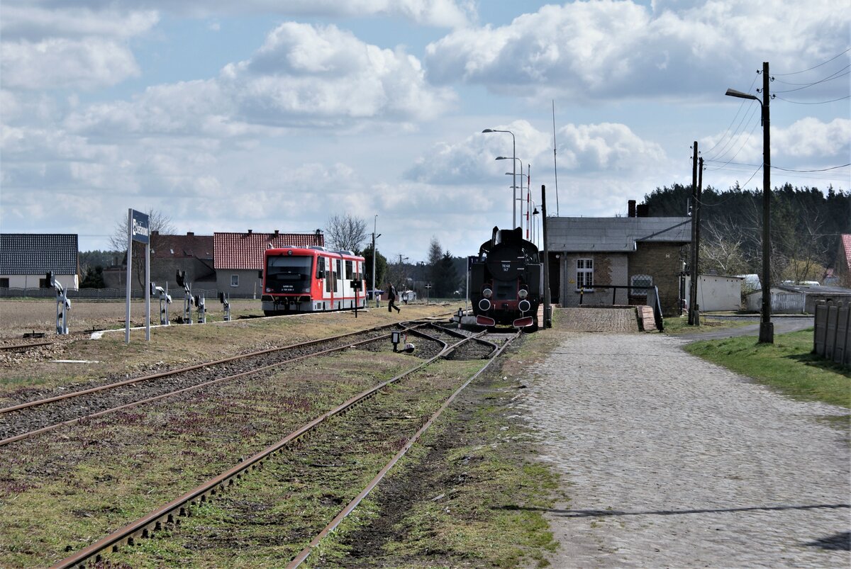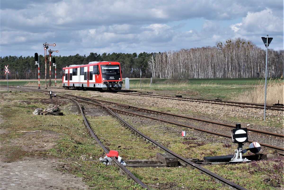 Polen Koleje Wielkopolskie Strecke 328 Leszno-Wolsztyn-Zbąszynek: SA108-001, Zug 77233 Leszno-Zbąszynek, Adamowo, 7. April 2022. Das rechte Gleis führte von Wolsztyn nach Nowa Sól und ist heute etwa zwei Kilometer hinter Kębłowo unterbrochen. Die Bahntrasse Sławocin-Kolsko-Konotop-Nowa Sól-Stipułów (einschliesslich der Brücke über die Oder bei Stany, aber ohne die Durchfahrt durch die Stadt Nowa Sól) dient heute als Radweg. Informationen hiezu finden sich unter dem Suchbegriff "kolejnarower" im Internet.